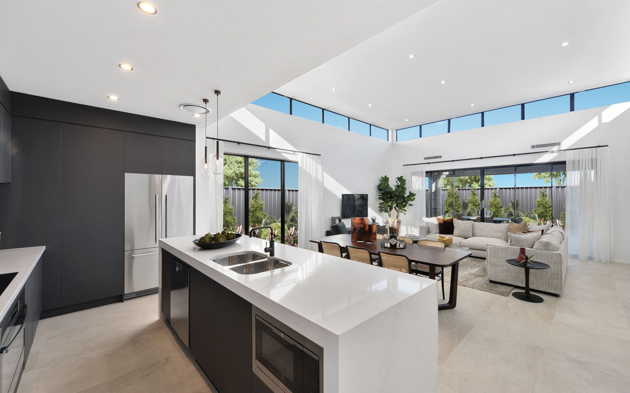 Open concept floor plans in the kitchen maximize space and minimize cost.